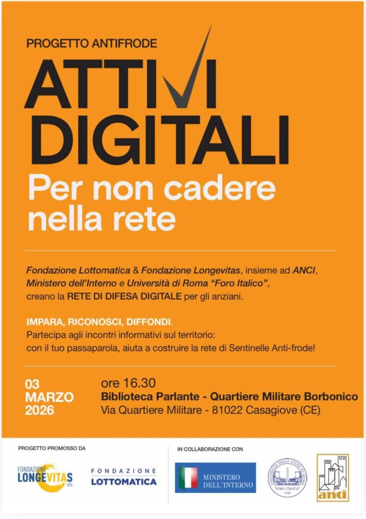 - “PROGETTO ANTIFRODE ATTIVI DIGITALI – PER NON CADERE NELLA RETE” organizzato dalle Fondazioni Lottomatica e Longevitas, martedì 03 marzo 2026 alle ore 16:30, presso il Quartiere Militare Borbonico a Casagiove.