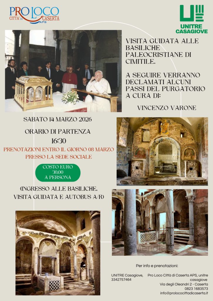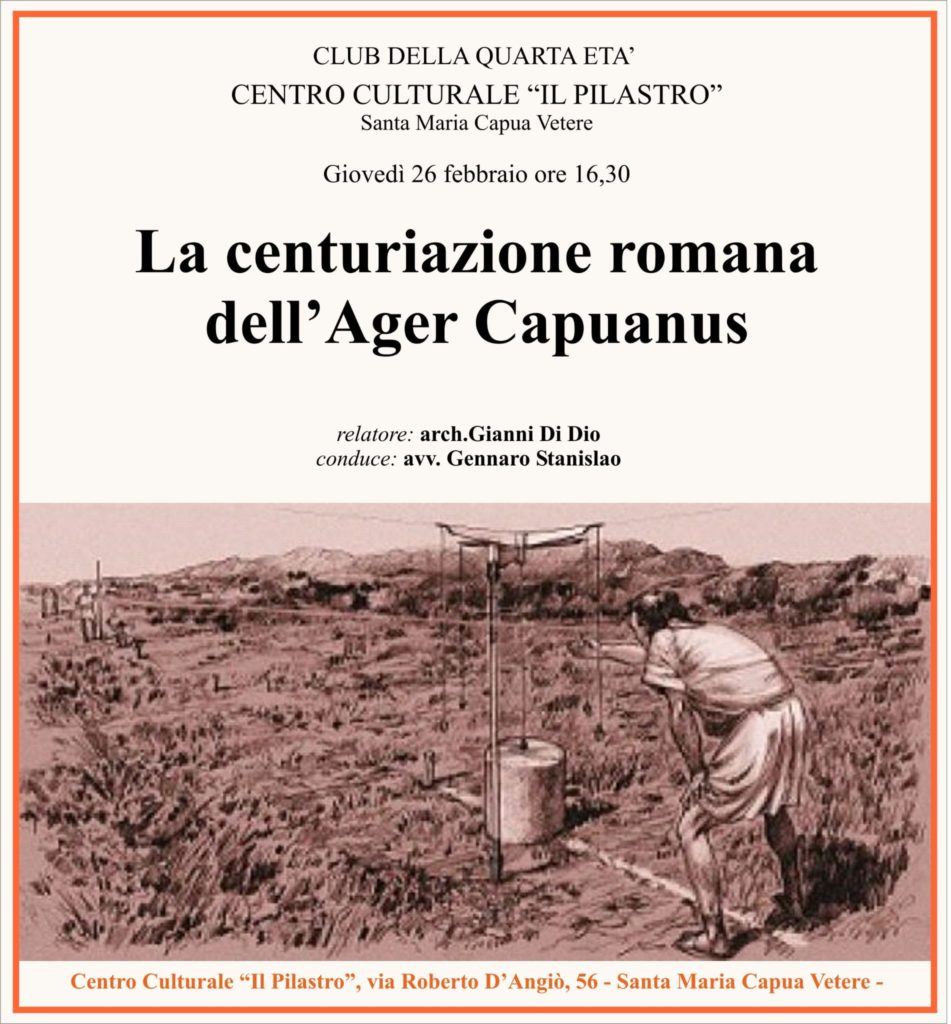 - “LA CENTURIAZIONE ROMANA DELL’AGER CAPUANUS” organizzato dal Club della Quarta Età, domani 26 febbraio 2026 alle ore 16:30, presso il Centro Culturale “IL PILASTRO” di Santa Maria Capua Vetere;