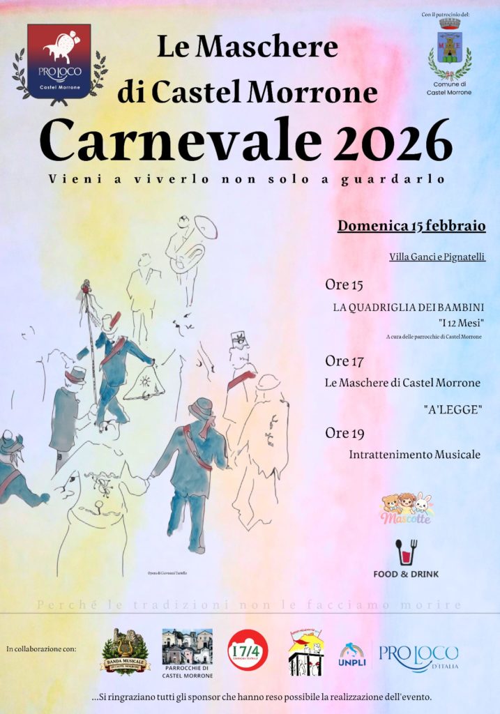 La pro loco di Castel Morrone, con la quale è in atto da tempo una proficua collaborazione, ha fatto pervenire la locandina di un evento legato al Carnevale 2026 che si terrà nella giornata di domenica 15 febbraio dalle ore 15:00.