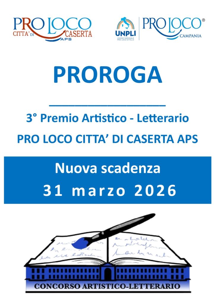 Il rinvio della Cerimonia di premiazione del 3° Premio Artistico – Letterario PRO LOCO CITTA’ DI CASERTA APS al 30 maggio 2026 consente di prorogare la scadenza per la presentazione delle opere di tutte le sezioni previste.