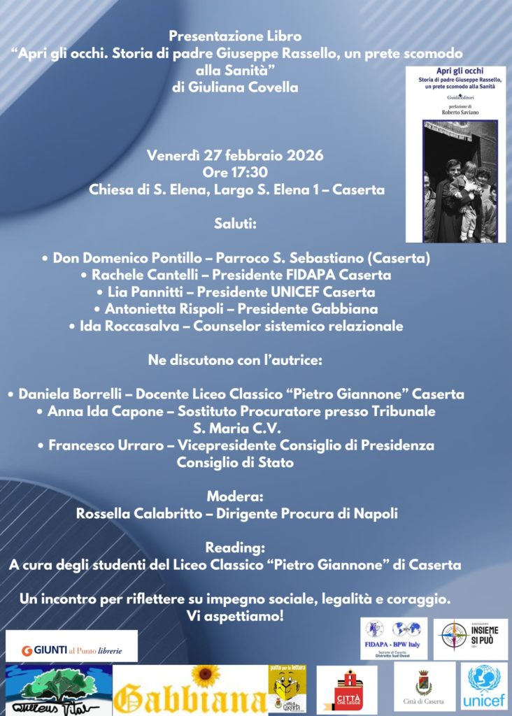 - Presentazione del libro “APRI GLI OCCHI. STORIA DI PADRE GIUSEPPE RASSELLO, UN PRETE SCOMODO ALLA SANITA’” organizzato da FIDAPA – BPW ITALY- Sezione di Caserta, venerdì 27 febbraio 2026 alle ore 17:30, presso la Chiesa di Sant’Elena – Largo S. Elena, 1 a Caserta;