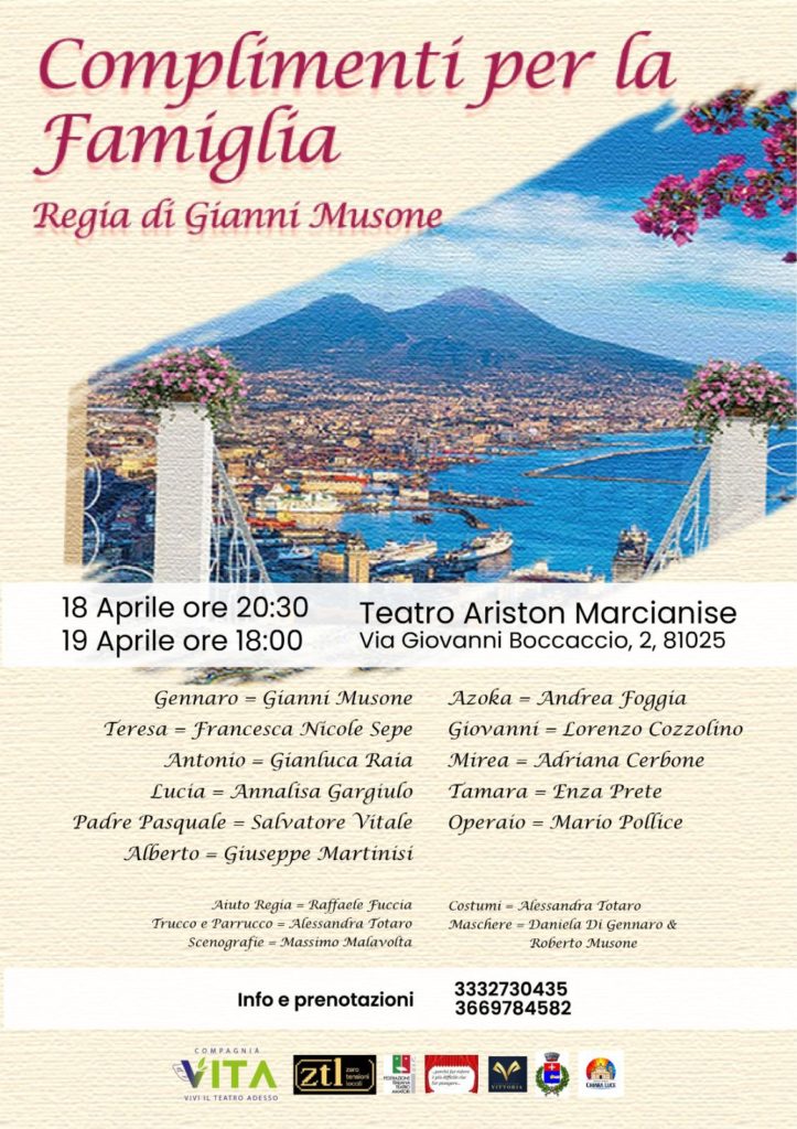 L’APS Ridiamo Insieme ed altre Compagnie presentano lo spettacolo teatrale “COMPLIMENTI PER LA FAMIGLIA” nei giorni: sabato 18 aprile alle ore 21:00, e domenica 19 aprile 2026 alle ore 19:00 presso il Teatro Ariston in Via Giovanni Boccaccio, Marcianise (CE).