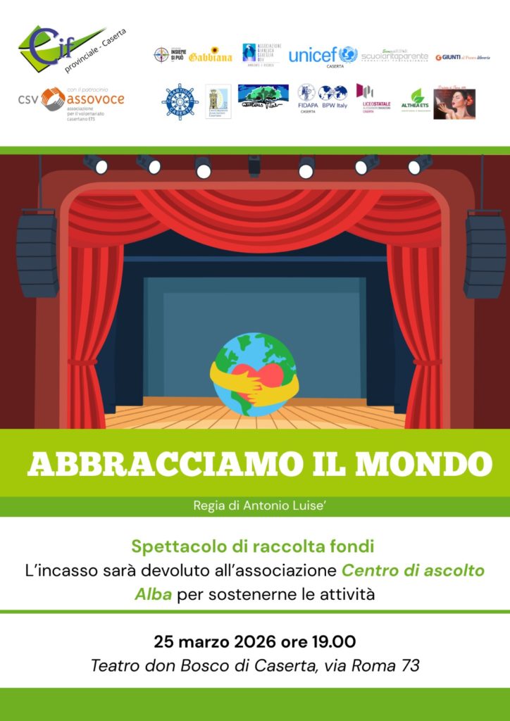 Il C.I.F. (Centro Italiano Femminile) Provinciale – Caserta ha organizzato lo spettacolo teatrale “ABBRACCIAMO IL MONDO” per sostenere il Centro di ascolto ALBA. Lo spettacolo si terrà il giorno 25 marzo 2026, alle ore 19:00, presso il Teatro Don Bosco di Caserta.