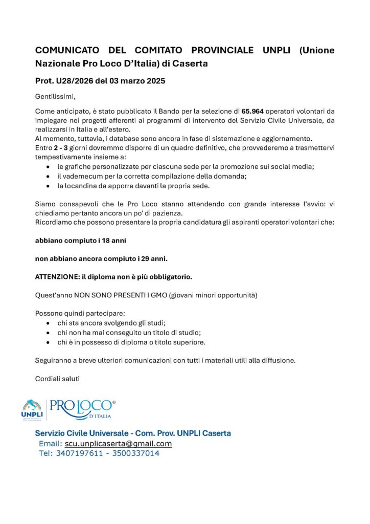 Si pubblica intanto la comunicazione pervenuta da UNPLI Caserta che si riserva entro pochi giorni di fornire dettagliate e definitive notizie in merito al bando.