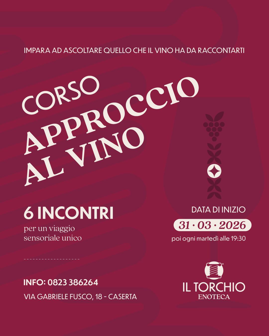 L’Enoteca IL TORCHIO in Via Gabriele Fusco, 18 a CASERTA con la quale la Pro Loco ha in atto una convenzione ha organizzato un corso di “APPROCCIO AL VINO” articolato su 6 (sei) incontri.