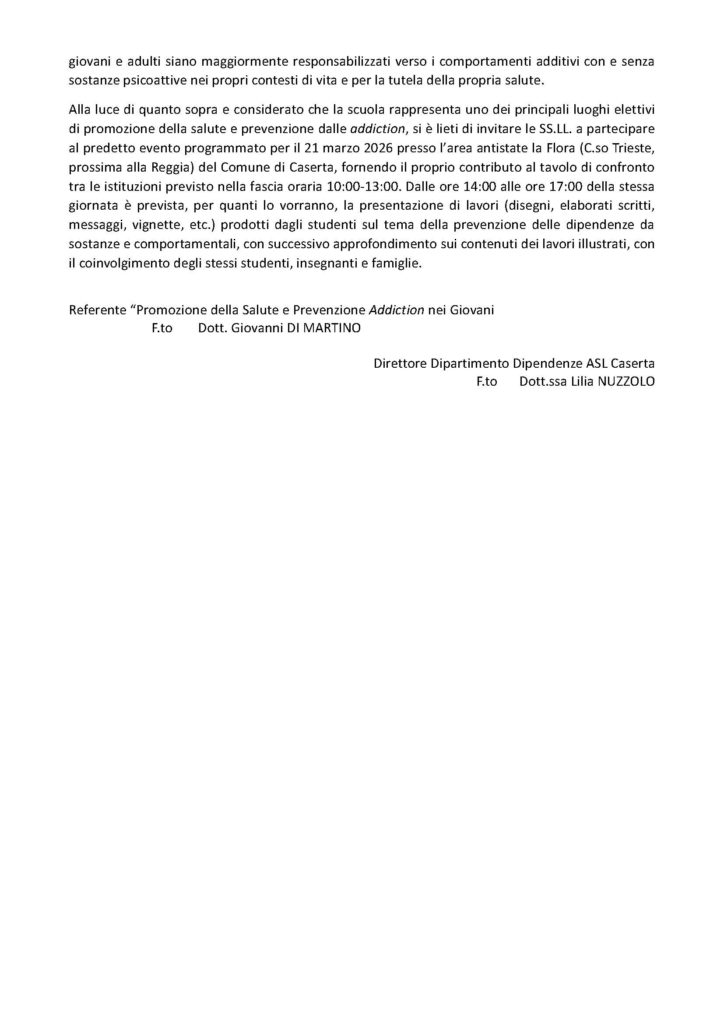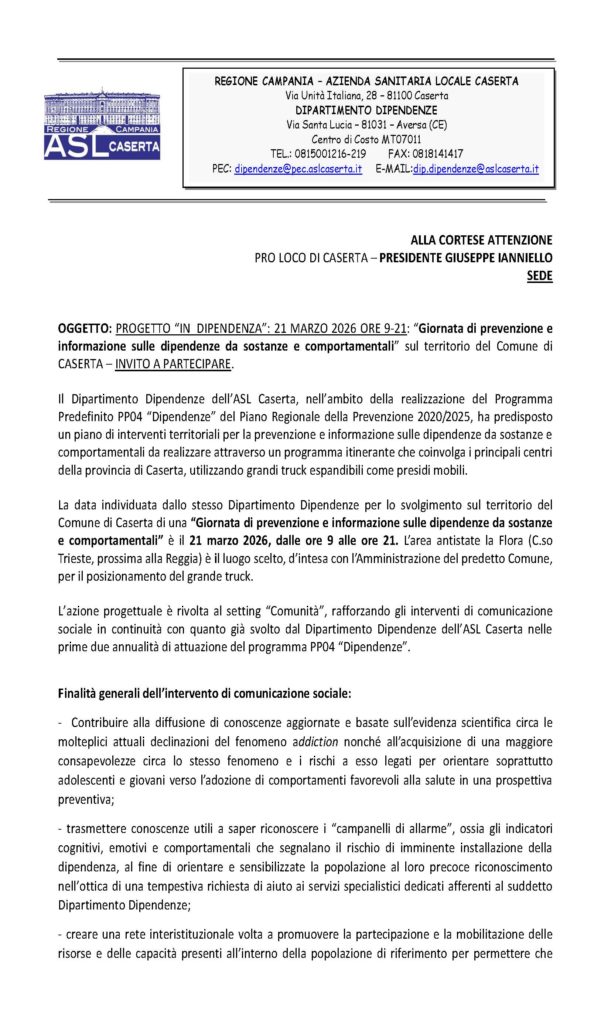 L’Azienda Sanitaria Locale di Caserta – Dipartimento Dipendenze, con il quale è in atto una proficua collaborazione, ha fatto pervenire invito alla partecipazione (in allegato) alla “Giornata di prevenzione e informazione sulle dipendenze da sostanze e comportamentali” che si terrà domani 21 marzo 2026, dalle ore 09:00 alle ore 21:00, nell’area antistante i giardini della Flora a Caserta (in prossimità della Reggia).