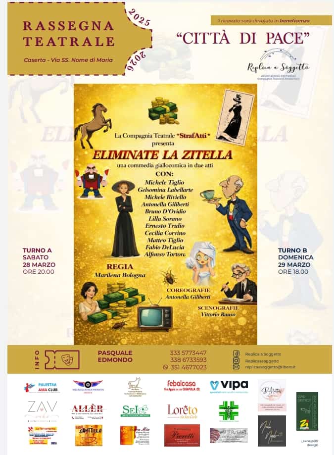 Nell’ambito della Rassegna Teatrale che si tiene presso il Teatro “Città di Pace” di Puccianiello sarà presentato lo spettacolo teatrale “ELIMINATE LA ZITELLA” a cura della Compagnia Teatrale “StrafAtti”.