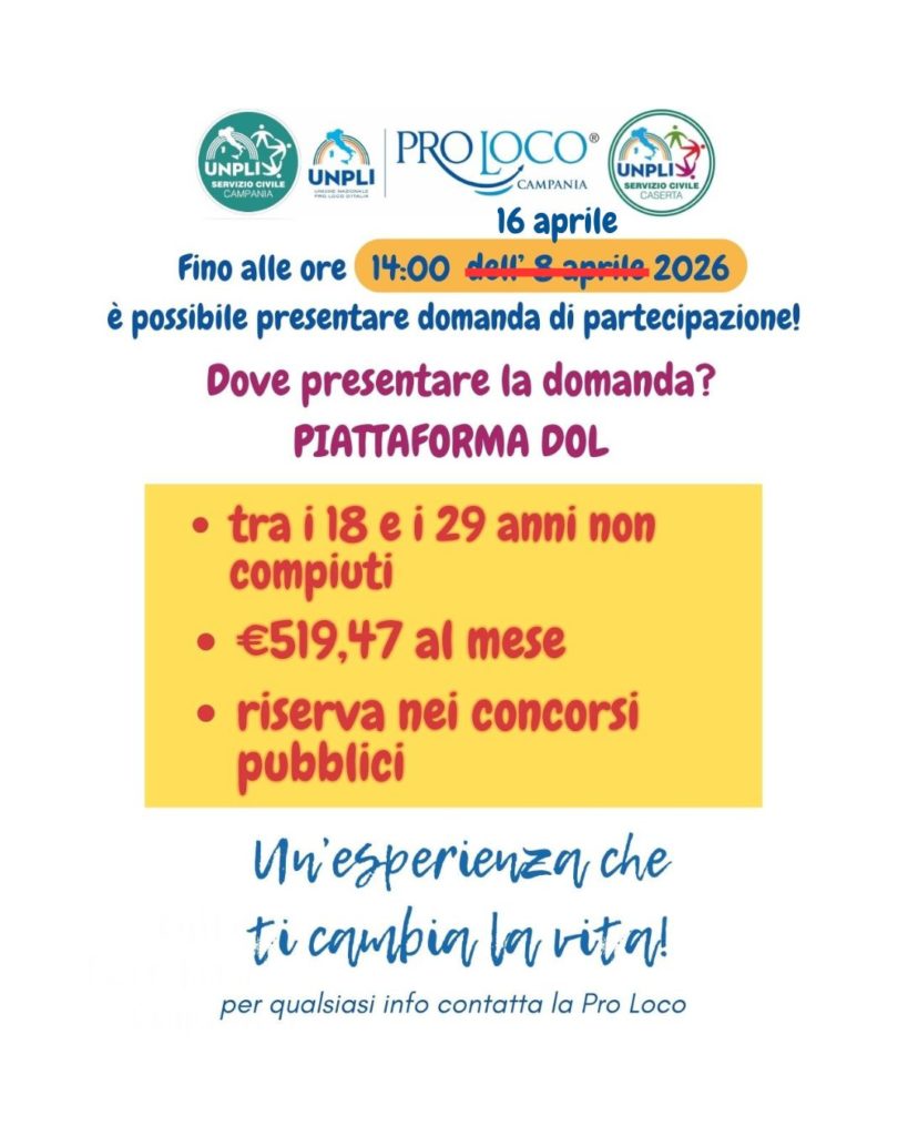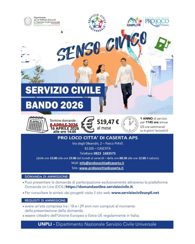 Dopo aver riportato le notizie di carattere si comunica che la Pro Loco Città di Caserta APS ha avuto assegnati 2 (due) posti disponibili per Volontari del Servizio Civile 2026/2027.