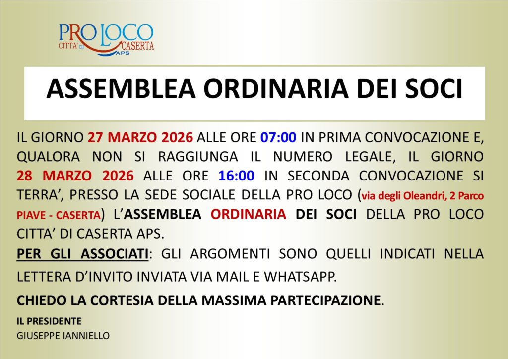 Pubblicato il 19 Marzo 2026 di Pro Loco Città di Caserta APSASSEMBLEA ORDINARIA DEI SOCI DELLA PRO LOCO CITTA’ DI CASERTA APS.