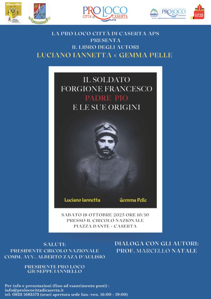 AVVISO : La Pro Loco Città di Caserta APS in collaborazione con il Circolo Nazionale di Caserta presenterà il giorno 18 ottobre 2025 alle ore : 10:30 il libro ” IL SOLDATO FORGIONE FRANCESCO -PADRE PIO E LE SUE ORIGINI ” degli autori Luciano Iannetta e Gemma Pelle.